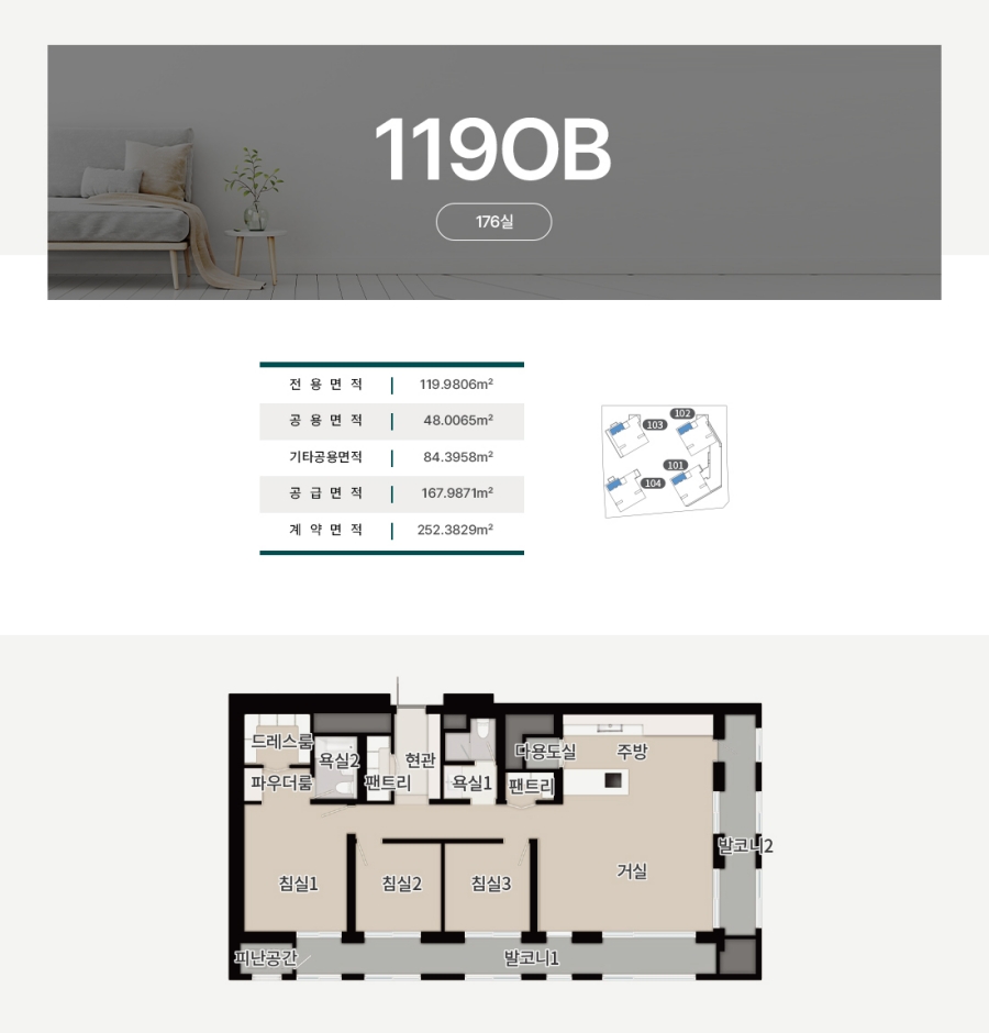 ※ 본 홈페이지에 명기된 면적의 소수점 이하 수치는 실제 시공 시 일부 변경될 수 있으며, 견본주택과 달리 평면이 좌우 반전될 수 있습니다.